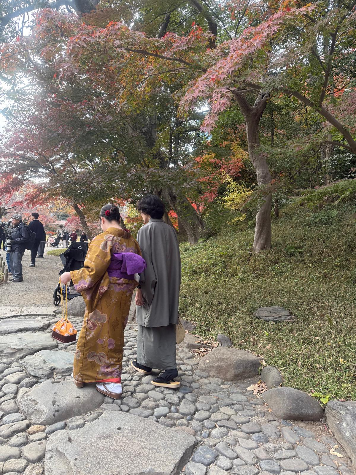 Ziel des zweiten Tags war ein entspannter Bummel durch Tokyos Viertel jenseits der großen Sehenswürdigkeiten. Wir starteten gemütlich mit einem japanischen Garten, der nicht auf den üblichen Top-5-Listen steht. Er war zwar gut besucht, aber man merkte deutlich, dass hier die lokalen Japaner am heutigen Feiertag die Nachmittagssonne genießen wollten. Überraschend viele haben sich dafür in traditioneller Kleidung schick gemacht.