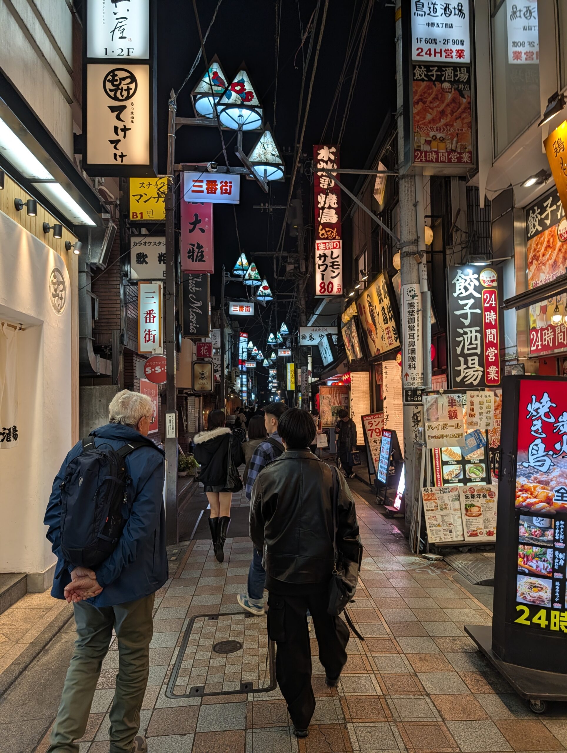 Ziel des ersten Abends war das Nachtleben von Tokyo und typisches japanisches Essen zu erleben. Nach einem Abstecher in eine berühmte Allee mit Gingko-Bäumen, um die Herbstlaubfärbung zu erleben, ging es dann durch verschiedene verwinkelte Gassen mit Läden und Kneipen. Fern des Touristenmagnets „Golden Gai“ wurden die Gassen immer kleiner und verwinkelter und die Kneipen immer winziger bis wir schließlich unser Ziel erreichten. Es gibt sie also immer noch, die Spots, die ein Tourist ohne Ortskundige nicht finden kann. Vor Ort bestellte der Student dann munter Gerichte von der japanischen Karte (keine englische Karte, keine englischsprachige Bedienung), die ich nie bestellt hätte, selbst wenn ich die Karte hätte lesen können (selbst Google Translate scheitert gerne mal bei Speisekarten, insbesondere wenn sie handgeschrieben sind). Gegrillte Hähncheninnereien, Pferde-Sashimi mit Zwiebeln und marinierte Haifischflossen waren nur Teil des Überraschungspakets.