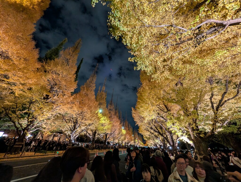 Ziel des ersten Abends war das Nachtleben von Tokyo und typisches japanisches Essen zu erleben. Nach einem Abstecher in eine berühmte Allee mit Gingko-Bäumen, um die Herbstlaubfärbung zu erleben, ging es dann durch verschiedene verwinkelte Gassen mit Läden und Kneipen. Fern des Touristenmagnets „Golden Gai“ wurden die Gassen immer kleiner und verwinkelter und die Kneipen immer winziger bis wir schließlich unser Ziel erreichten. Es gibt sie also immer noch, die Spots, die ein Tourist ohne Ortskundige nicht finden kann. Vor Ort bestellte der Student dann munter Gerichte von der japanischen Karte (keine englische Karte, keine englischsprachige Bedienung), die ich nie bestellt hätte, selbst wenn ich die Karte hätte lesen können (selbst Google Translate scheitert gerne mal bei Speisekarten, insbesondere wenn sie handgeschrieben sind). Gegrillte Hähncheninnereien, Pferde-Sashimi mit Zwiebeln und marinierte Haifischflossen waren nur Teil des Überraschungspakets.